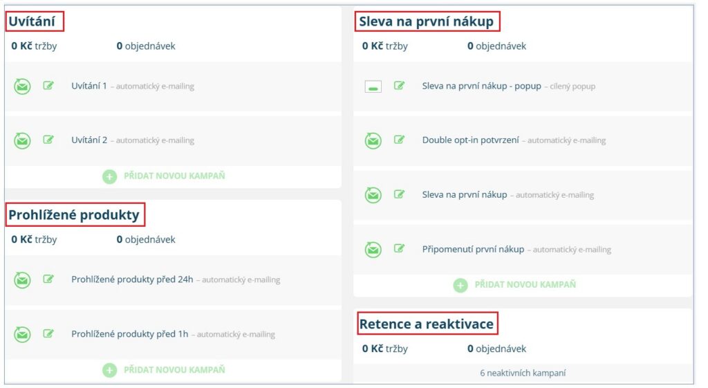 | Přehled o chování zákazníků na webu a vizualizace funnelu | Chybí vizuální editor pro automatické kampaně |