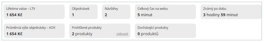 Tento analytický přesah pomáhá e-shopům pochopit skutečnou hodnotu jejich zákazníků a budovat dlouhodobé vztahy. Návštěvy a Čas na webu odhalí, jak velký zájem zákazník má, Docházející produkty a Známý po dobu umožňují zlepšit načasování a predikci.