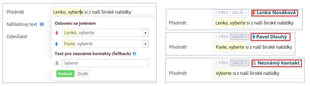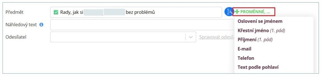 Texty můžete doplnit o proměnné, které umožňují vkládat libovolné údaje z vašeho systému. Díky tomu snadno proměníte obecný e-mail v unikátní zprávu šitou na míru každému kontaktu. Personalizovat lze i jednotlivé části e-mailu, a to podle pravidel, které si sami nastavíte. Jednomu příjemci se tak zobrazí jiný obsah než jinému. Jak jsme psali výše, s proměnnými se pracuje mnohem snáz než v konkurenčních nástrojích, protože nemusíte používat zástupná hesla a rovnou v náhledu vidíte, jak bude obsah e-mailu vypadat. Totéž platí i pro dynamické bloky. Tato funkce však může být pro některé uživatele matoucí, když vidí rovnou vyplněné údaje (že jde ve skutečnosti jen o náhled dynamicky vkládaných informací).